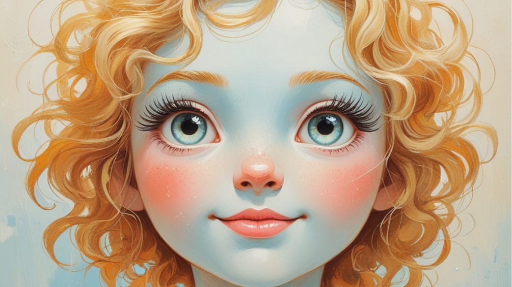 Fair or warm complexion with a soft glow. Symmetrical face, round shape. Big expressive eyes with long lashes, eye color could be hazel blue, lips are naturally pink, full and smiling slightly. . Short brownish golden hair, small and delicate nose, soft blurred background .