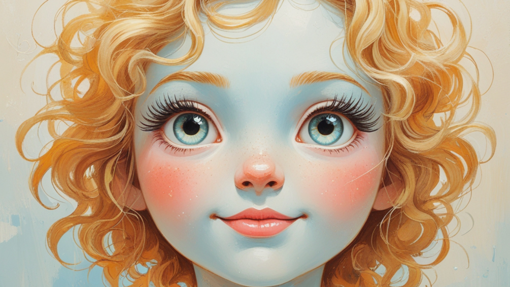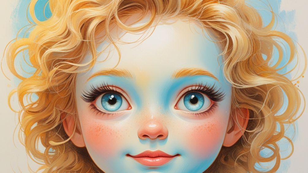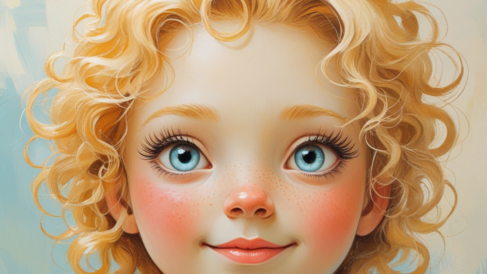 Fair or warm complexion with a soft glow. Symmetrical face, round shape. Big expressive eyes with long lashes, eye color could be hazel blue, lips are naturally pink, full and smiling slightly. . Short brownish golden hair, small and delicate nose, soft blurred background .